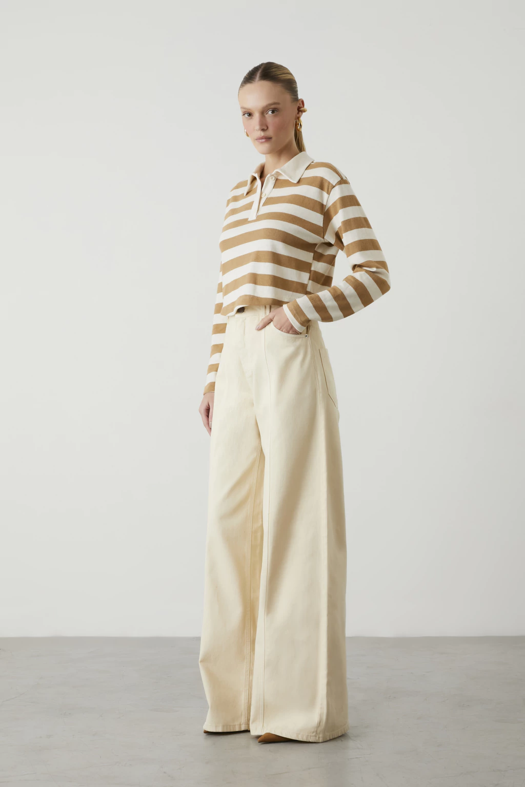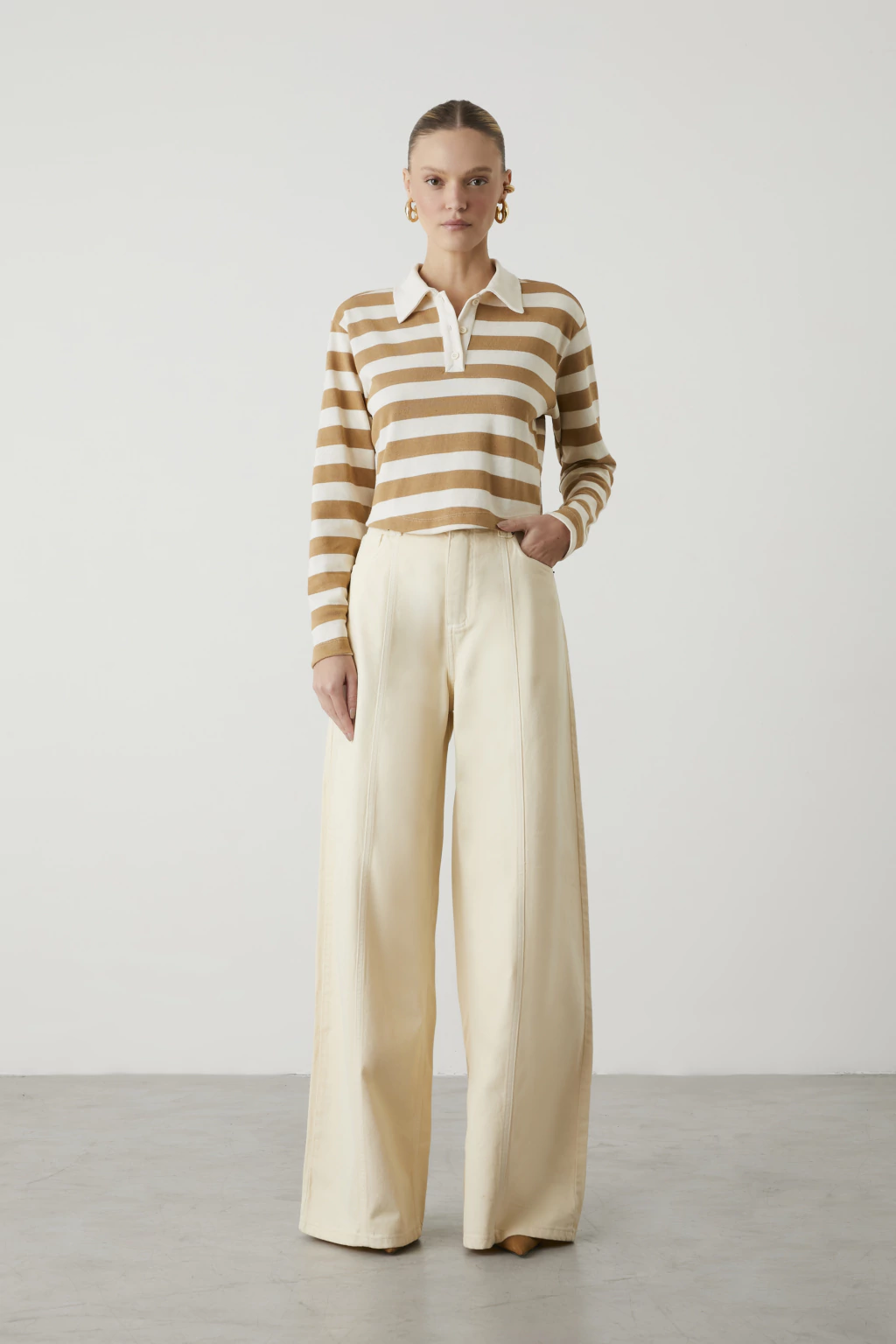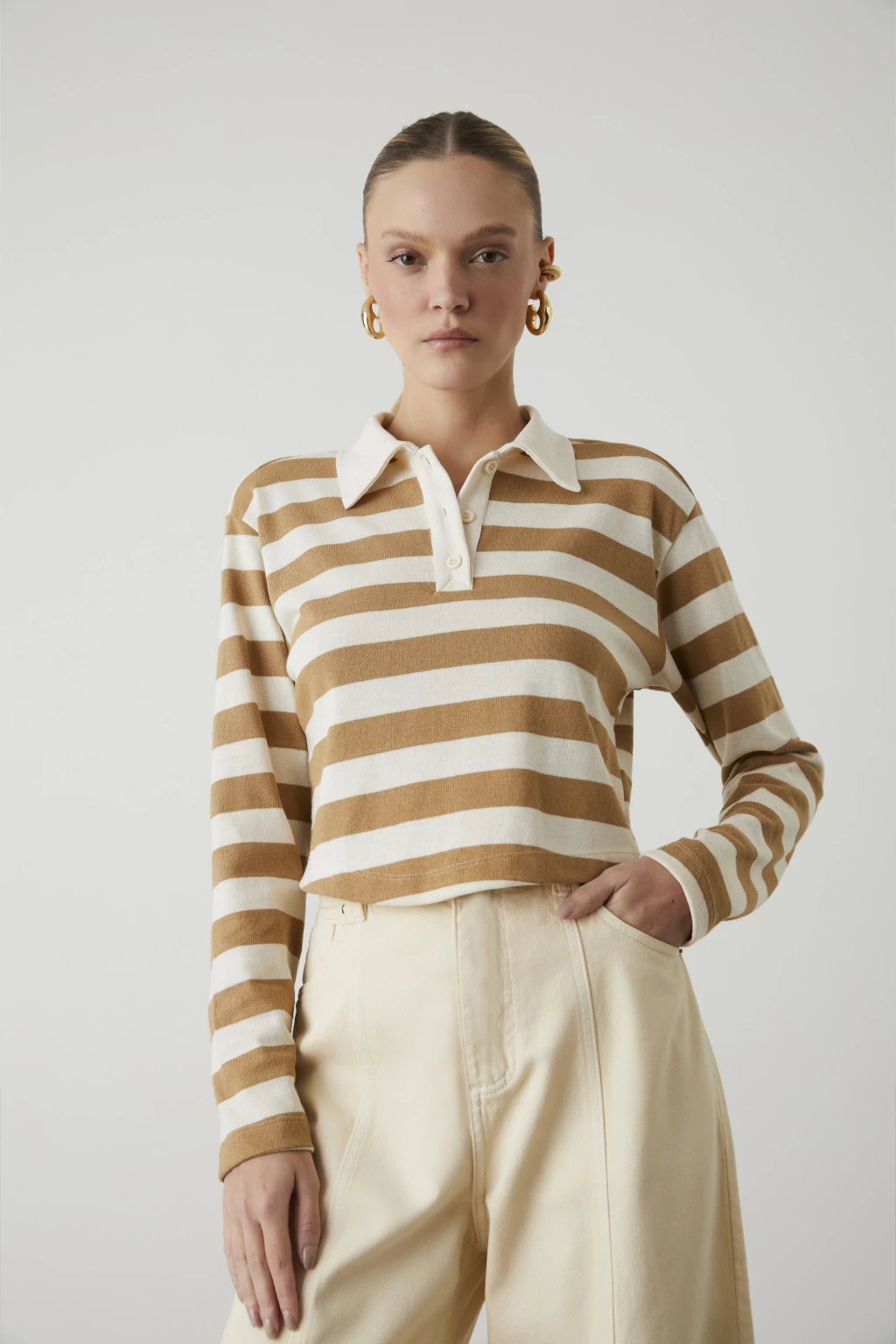 Descubra a elegância da Blusa Mel Bege, uma peça essencial para quem busca sofisticação e conforto. Confeccionada em 100% algodão, possui modelagem polo, manga longa e fechamento em botões na gola. O charme fica por conta do detalhe de listras e da gola em tecido liso, elevando o visual de forma sutil e refinada.