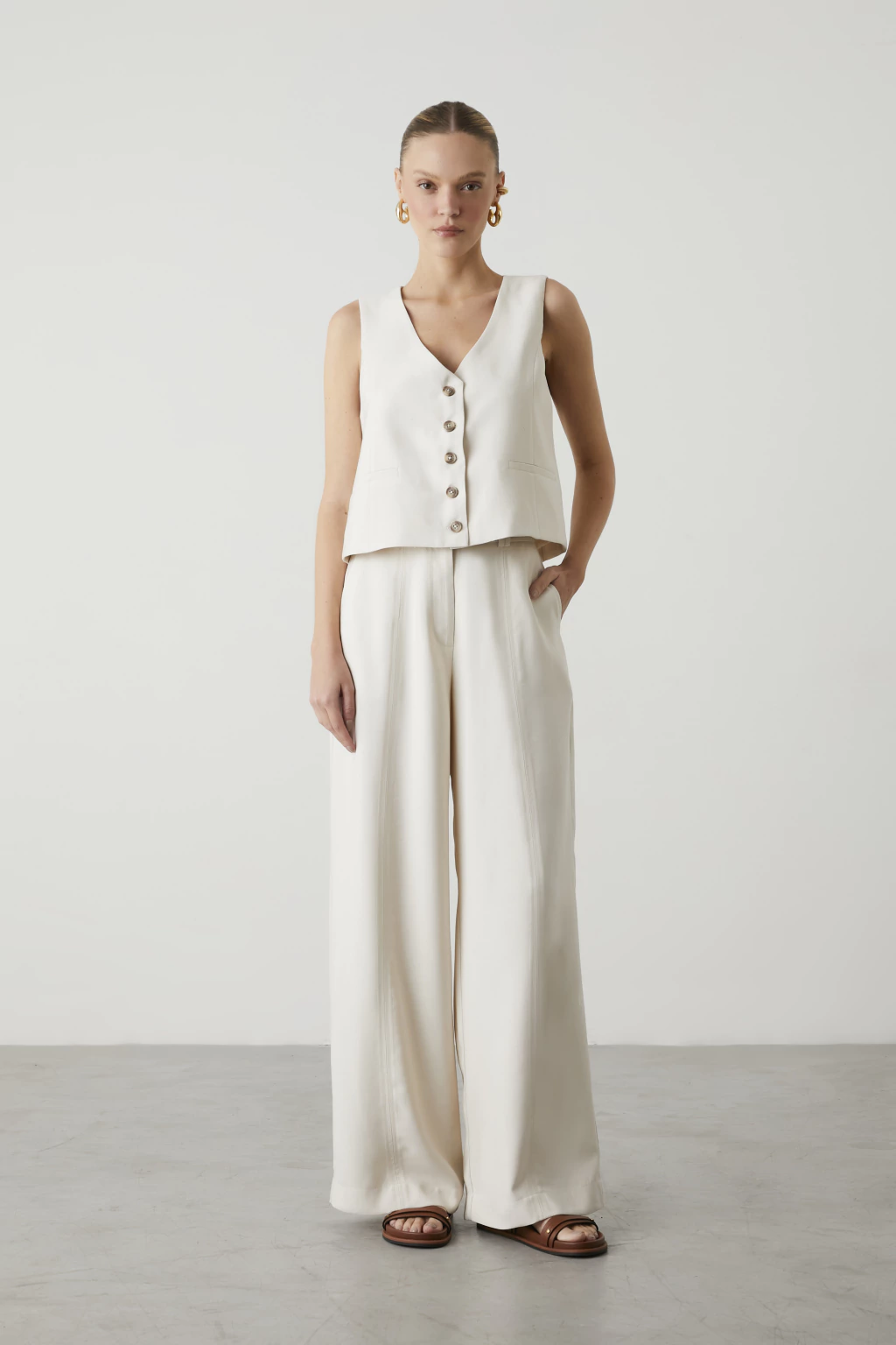 Descubra a elegância da Calça Tarsila Aveia, ideal para um visual sofisticado e contemporâneo. Com modelagem pantalona, possui cós mais largo, fechamento em zíper e botão, além de passante duplo. Os bolsos laterais e traseiros trazem praticidade, enquanto o detalhe de pesponto na frente e costas destaca o acabamento refinado. Aposte em versatilidade e estilo com essa peça única!
