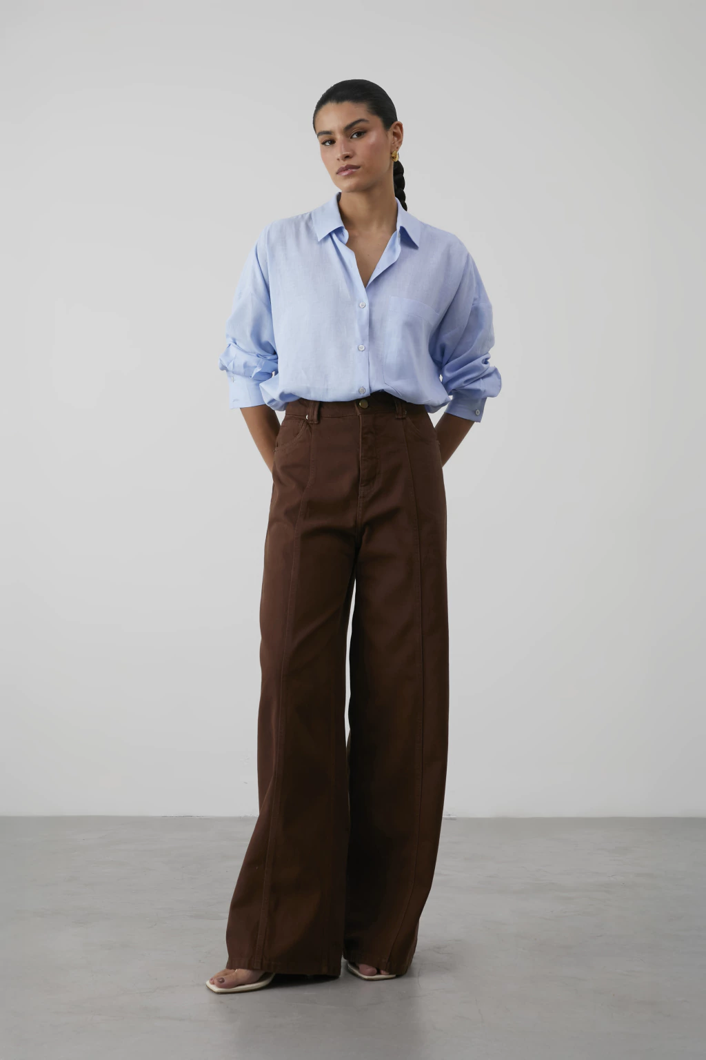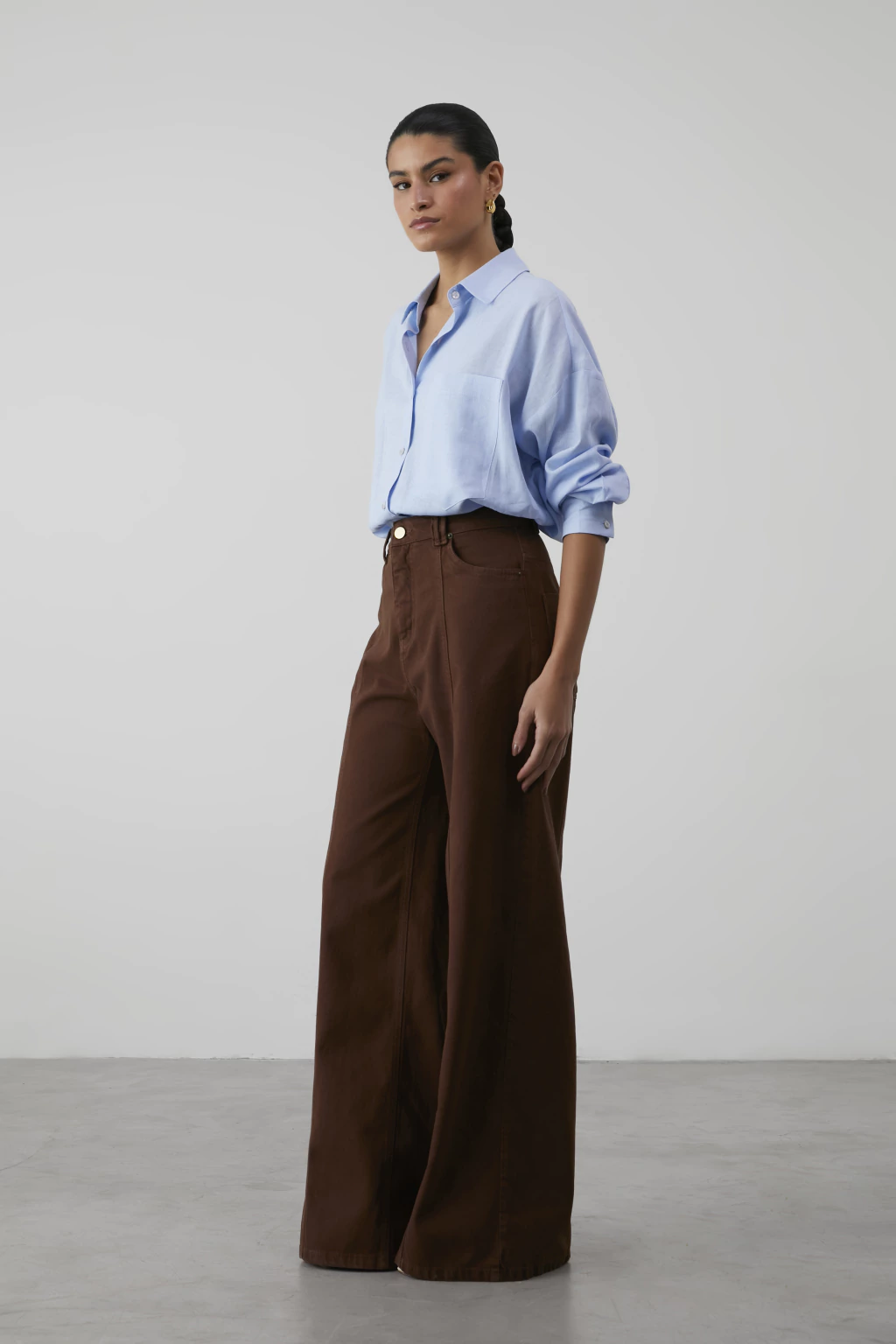 Na parte de trás, a camisa exibe uma prega fêmea central e uma pala nas costas, garantindo um caimento impecável e um visual moderno. O charme adicional é proporcionado pelos botões de madre pérola, que conferem um brilho sutil e sofisticado à peça.