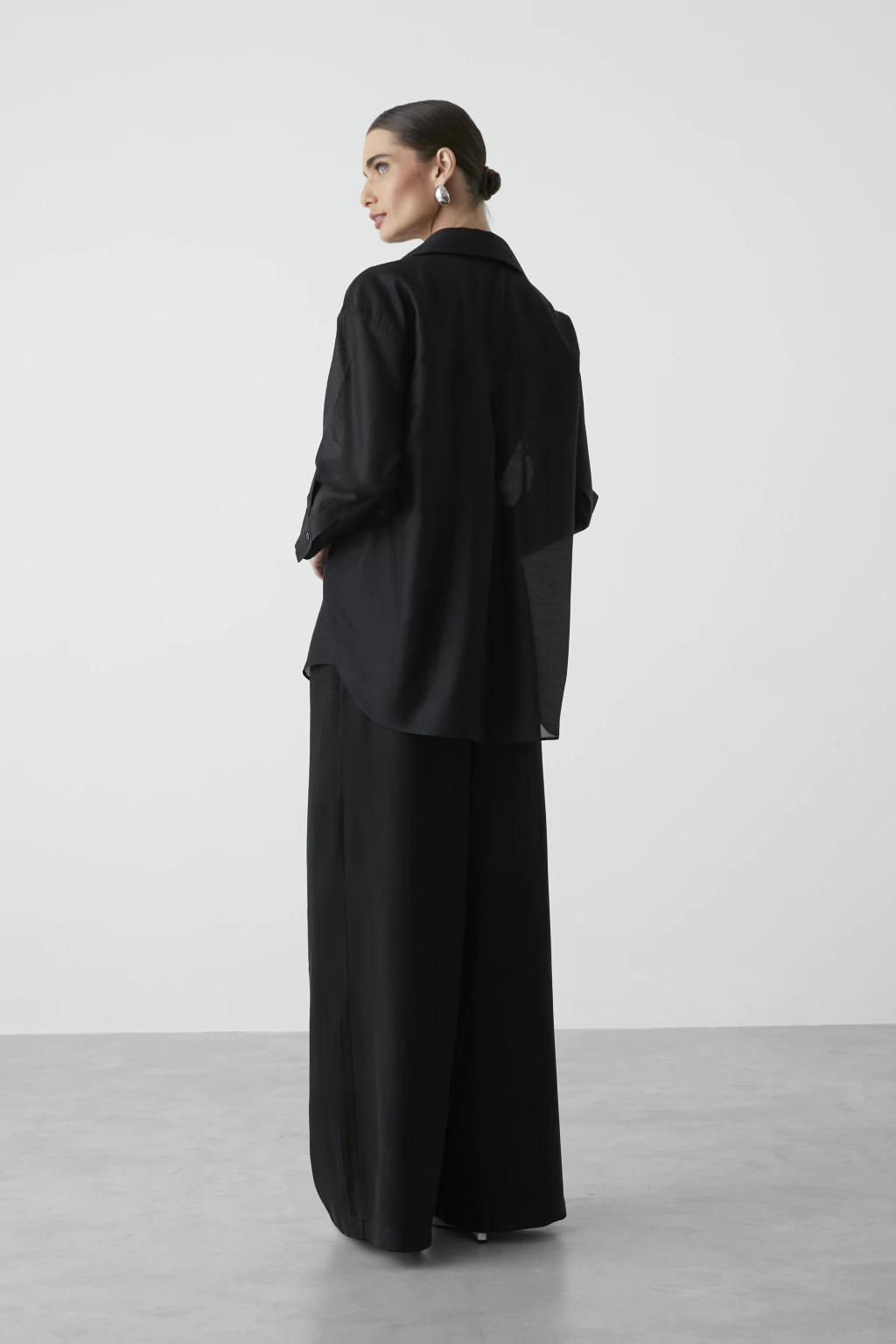 Descubra a sofisticação da Camisa Paola Preto, uma peça elegante e moderna. Este modelo oversized apresenta fechamento em botões na frente e punhos, ideal para quem busca estilo e conforto. Feita de tecido leve com um toque acetinado, possui uma leve transparência que adiciona charme e elegância. Transforme seus looks com esta camisa versátil e atemporal.