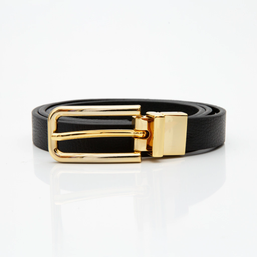 Descubra a elegância do Cinto Carla Preto com Dourado, confeccionado em 100% couro preto de alta qualidade. O destaque fica para a fivela de metal dourado e o passante em metal, que agregam sofisticação ao visual. Ideal para valorizar qualquer look, une luxo e versatilidade em um só acessório.