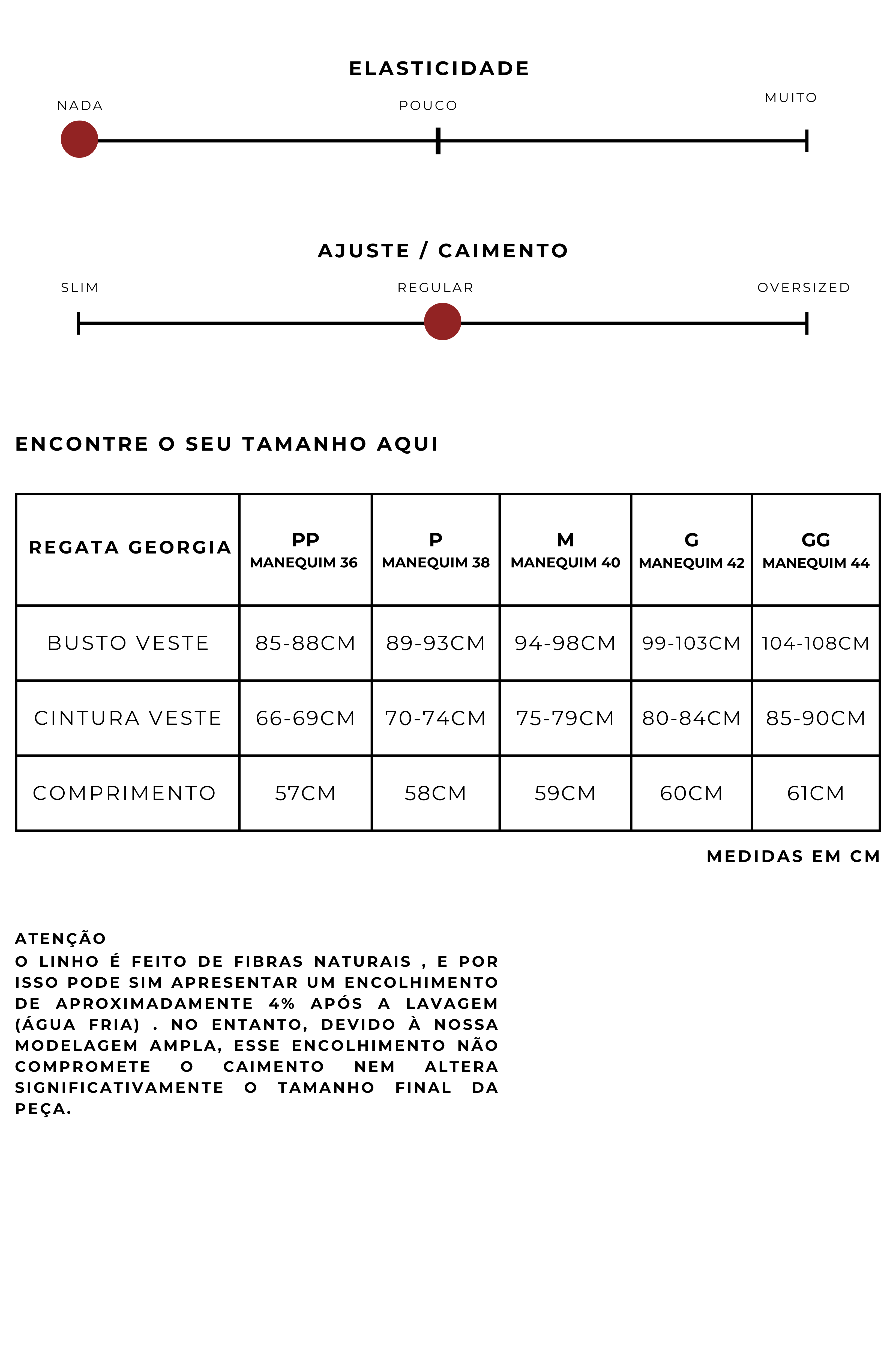 Descubra a sofisticação da Regata Georgia Preto, confeccionada em 100% linho. Com um toque de elegância, possui cava francesa e um detalhe de franzido na gola. O design é complementado por um leve detalhe de abertura nas laterais e um fechamento com botão madre pérola nas costas, garantindo um acabamento refinado e moderno.