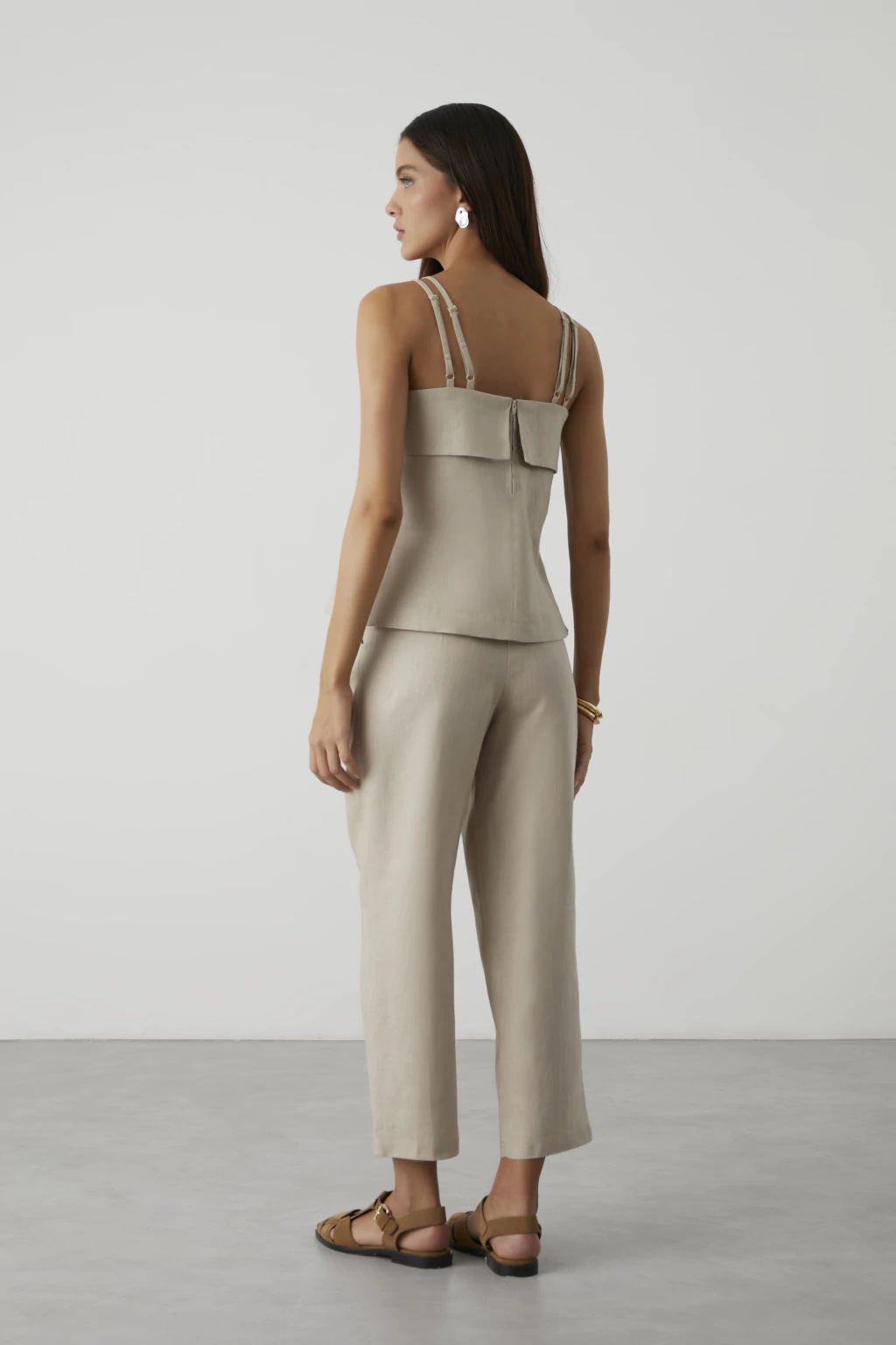 Descubra a elegância da Regata Jordania Bege, feita em 100% linho. Com alças finas duplas ajustáveis e detalhe de pala no decote, esta regata proporciona sofisticação. A leve abertura nas laterais e o fechamento de zíper nas costas completam o design. O detalhe de pence no busto garante um ajuste perfeito, tornando-a ideal para compor looks refinados.