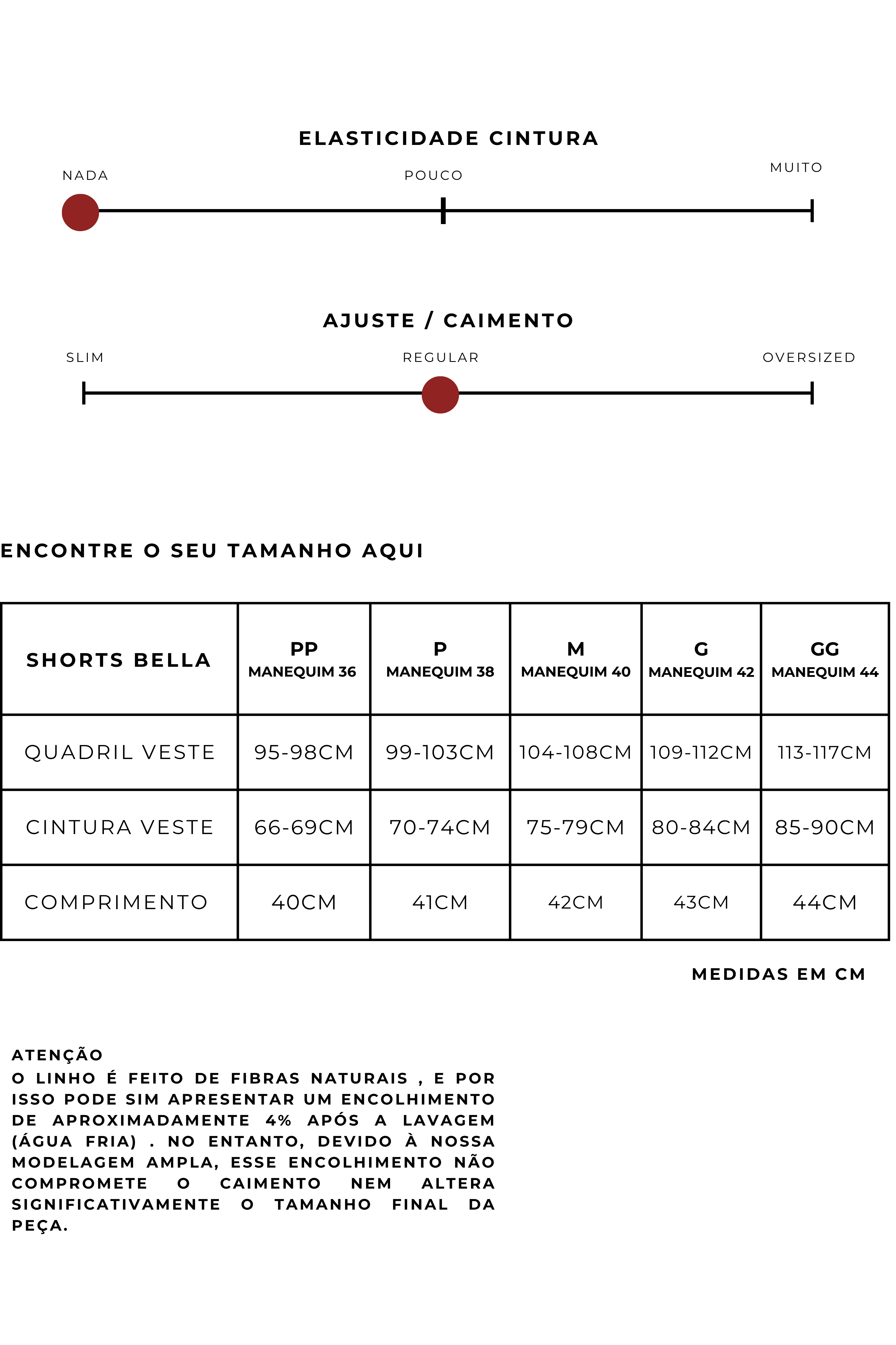 Descubra a elegância do Shorts Bella Preto, confeccionado em puro linho para um toque sofisticado. Este modelo possui bolsos laterais e nervura frontal, além de pence costas que garantem um ajuste perfeito. O fechamento por botão e zíper e os passantes para cinto largo adicionam praticidade e estilo. Com dois bolsos posteriores e sem forro, é a escolha ideal para ocasiões elegantes e casuais.