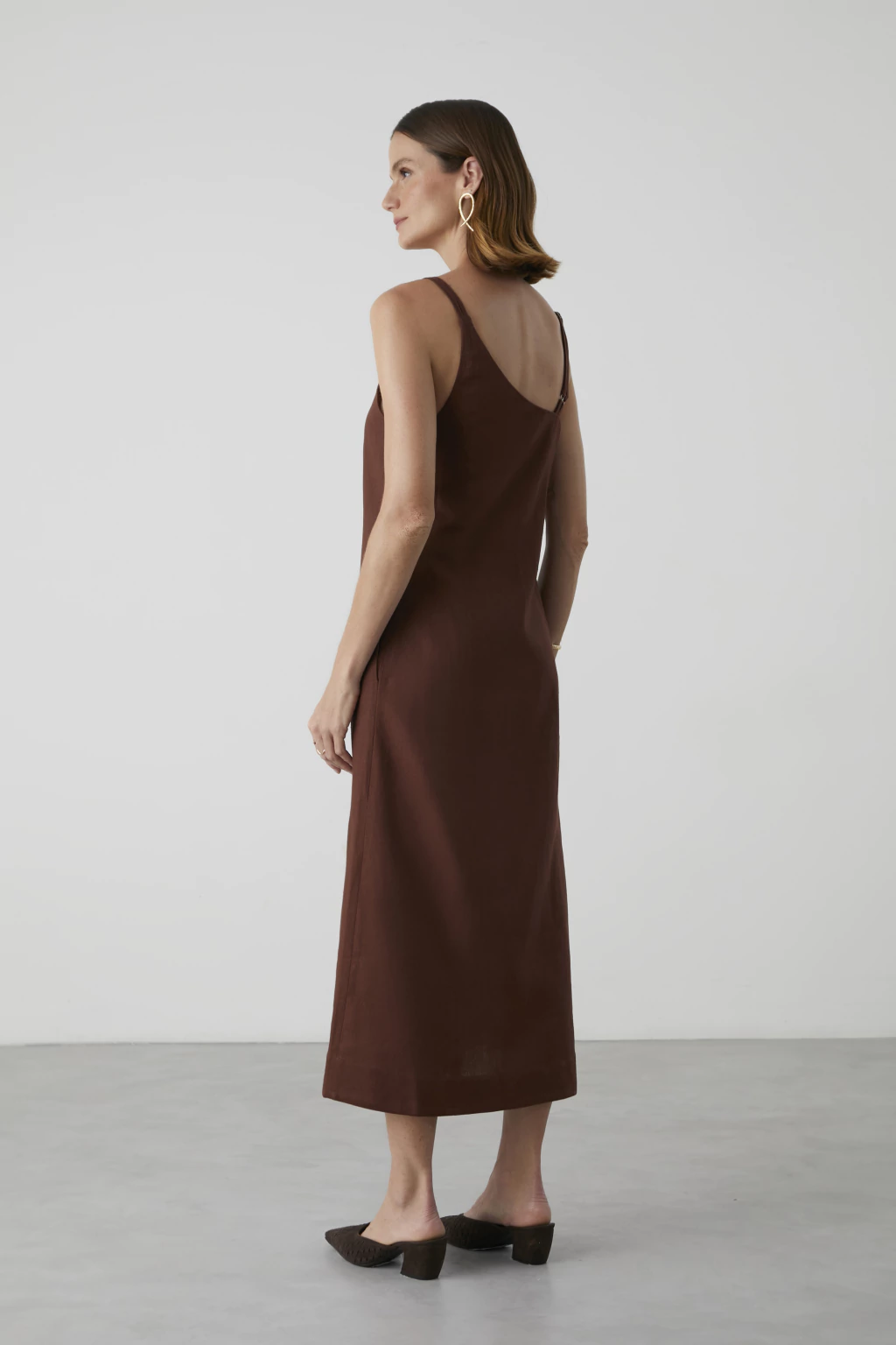 Descubra a elegância do Vestido Diana Marrom, uma peça sofisticada que exala charme. Com bolsos laterais e detalhe de alças duplas, sendo uma ajustável, este vestido oferece conforto e estilo. O decote assimétrico e o fechamento de zíper invisível lateral garantem um caimento perfeito e moderno. Seja o centro das atenções em qualquer ocasião com esta peça única e versátil no seu guarda-roupa.