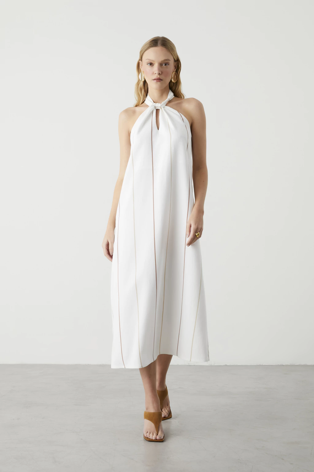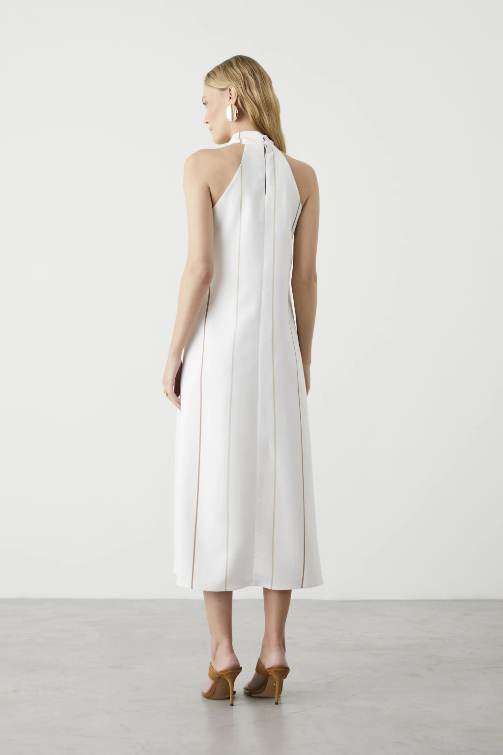 Descubra a elegância do Vestido Natasha Off White, perfeito para ocasiões especiais e dias que pedem sofisticação. O modelo midi destaca-se pelo detalhe de torção na alça e decote, além das listras sutis no tecido. Conta com bolsos laterais práticos e fechamento nas costas com botão perolado. Peça totalmente forrada, garantindo conforto e evitando transparência.